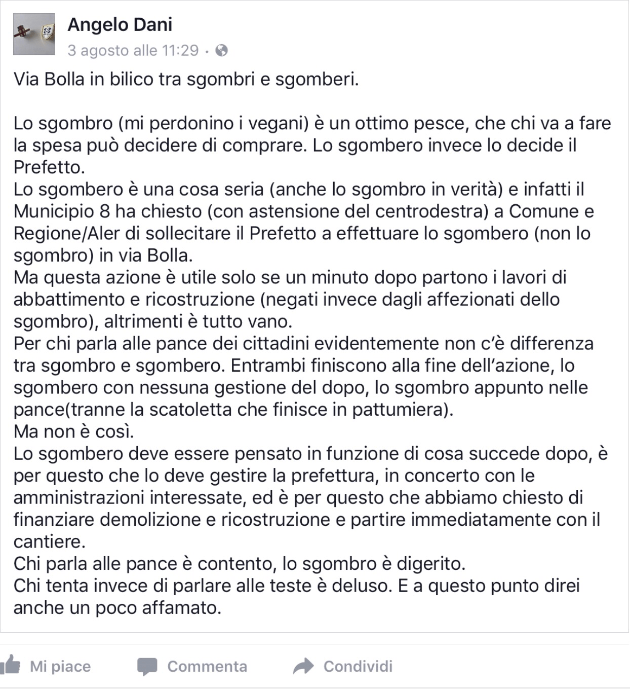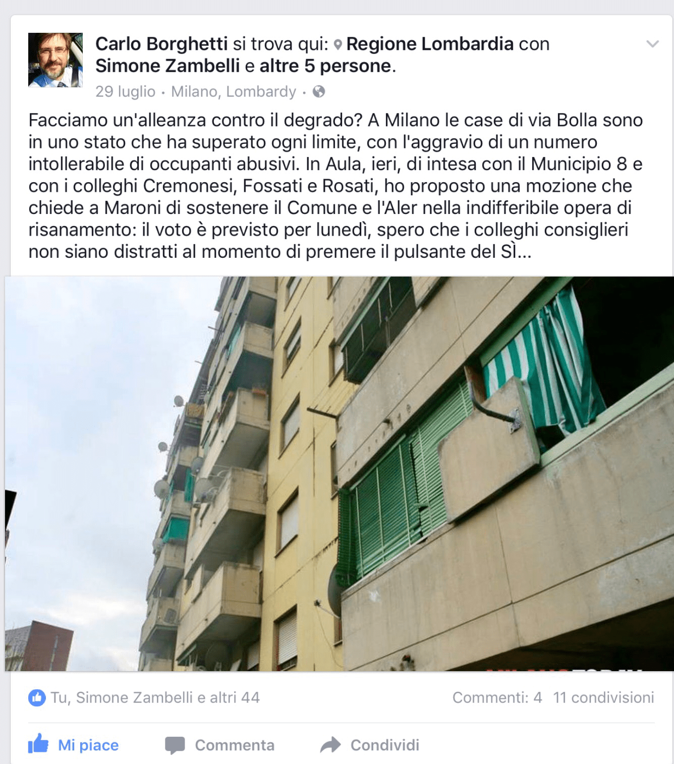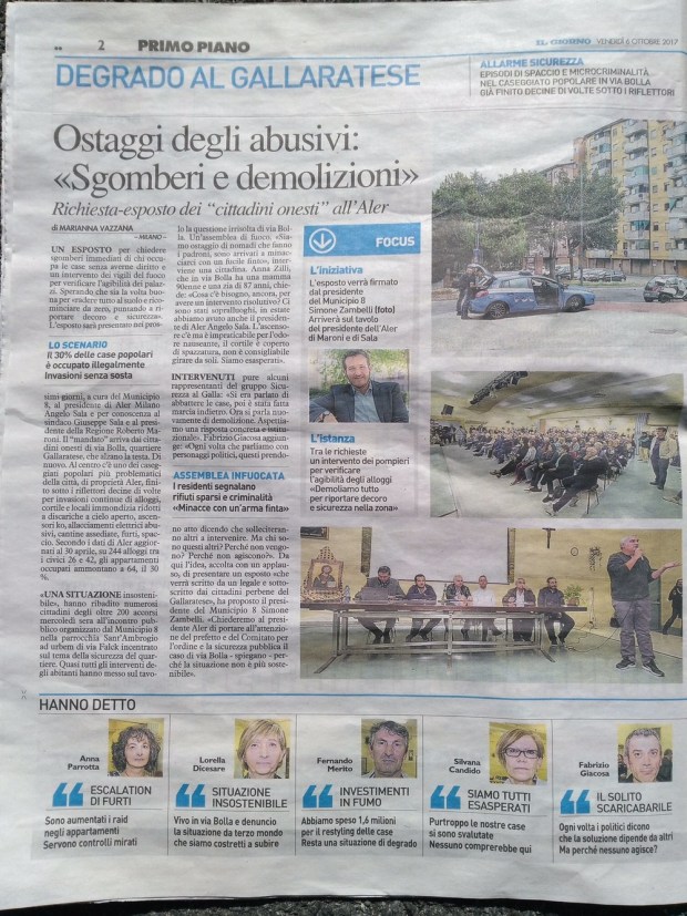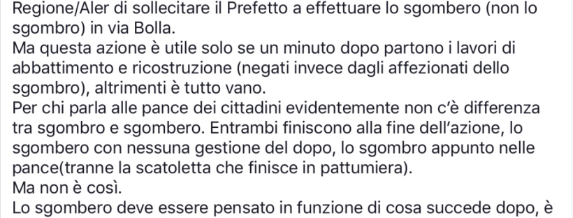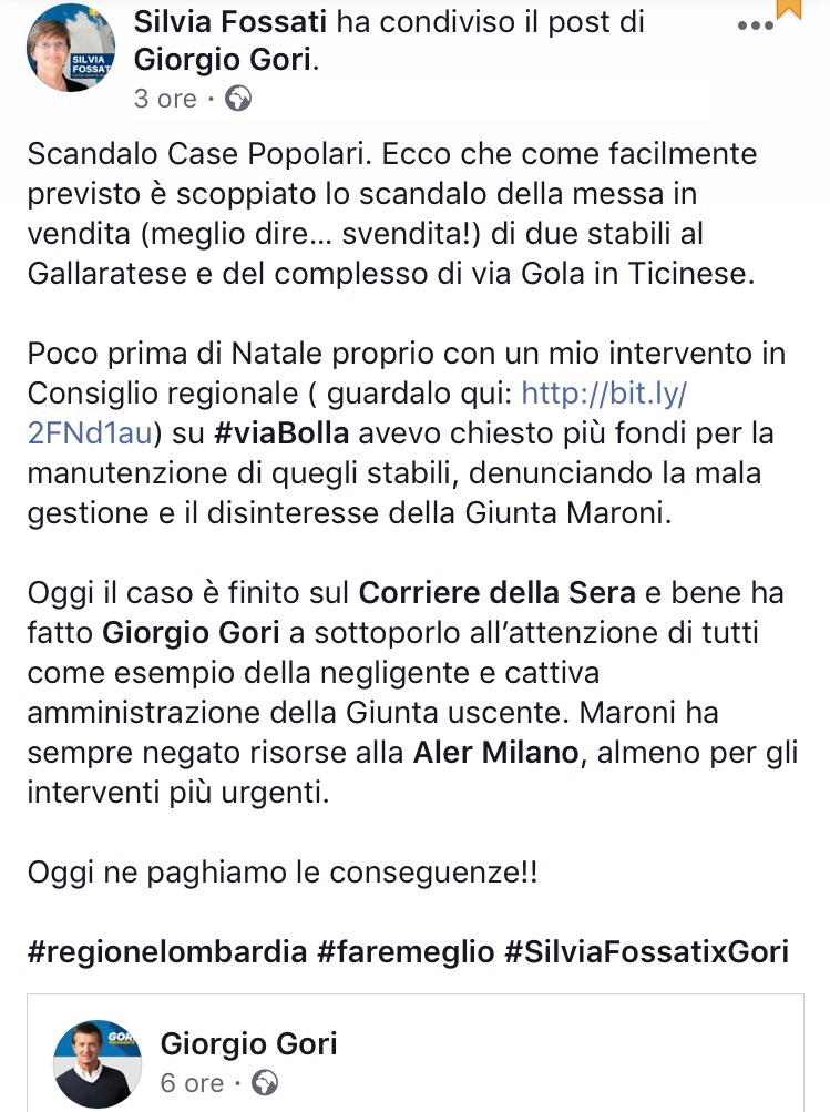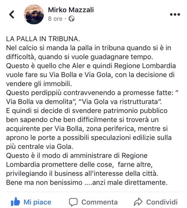 Nemmeno il centrodestra che parla senza remore di “razza bianca” ha faccia tosta abbastanza da ritenere le case Aler (partecipata della Regione di cui la Regione è responsabile soprattutto in materia di stanziamenti) siano un esempio di buon governo. Lavori non fatti, alloggi occupati. Stupisce che invece di annunciare un cambio di rotta e magari spiegare cosa non ha funzionato, si faccia scarica barile sui Comuni in particolare quelli guidati dal centrosinistra come Milano, dicendo cose inverosimili come ad esempio che la responsabilità è del Comune di Milano che ha avuto una politica di accoglienza nei confronti degli stranieri i quali avrebbero occupato in massa le case popolari e reso le periferie invivibili.Vorrei dire due cose su questo dibattito relative alla mia esperienza di consigliera al Municipio 8 di Milano che comporta fra le sue sfide anche quella delle case Aler di via Bolla ritenute dallo stesso presidente Aler, Angelo Sala, un’emergenza fino a luglio. La prima è che è stata una situazione che Regione Lombardia non ha governato e di fronte a cui Aler ha avanzato soluzioni contraddittorie: perdete qualche minuto a leggere questa infografica (si apre cliccando sulla parola infografica) è una timeline che mostra quanto è successo attorno a questa vicenda da giugno, divisa in due colonne: una su quanto fatto in Regione, l’altra su quanto fatto in Municipio, Comune o uscito sui giornali. Quello che appare evidente è che la Regione non ha fatto nulla, salvo respingere le proposte di soluzione del centrosinistra. Qui non centra la partecipata, la responsabilità è della Regione di una classe politica che lascia andare e non si occupa delle problematiche. Mi chiedo che senso abbia rinnovare la fiducia a chi finanzia i campi da golf e non trova i soldi per le case popolari come accaduto in Regione a luglio.
