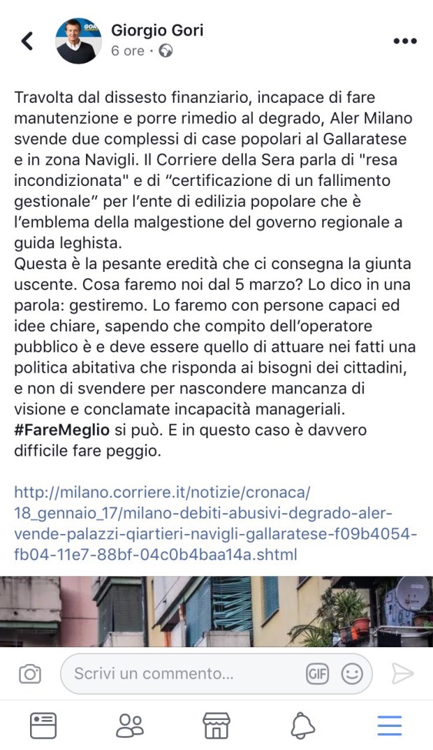 Per essere eletti o rieletti alla guida di un’istituzione, soprattutto se importante come Regione Lombardia, bisogna dimostrare di saper governare, mi pare lapalissiano e davvero non comprendo lo stupore che in alcuni si genera quando al centro del dibattito elettorale finiscono situazioni mal gestite, soprattutto se riguardano diritti fondamentali come quello alla casa e le classi più disagiate.